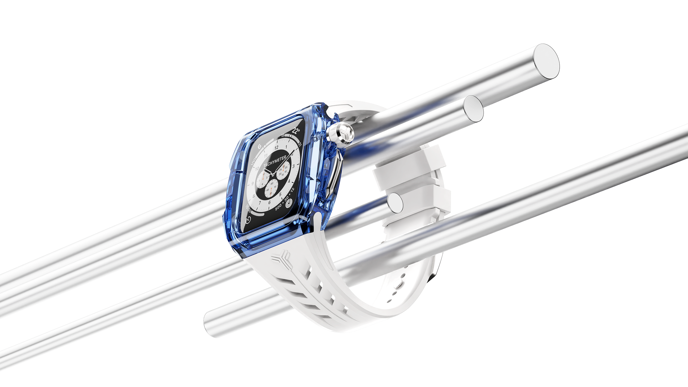 Enhance your Apple Watch 45mm with the Bondi Nylon Edition. Featuring a bright white strap and a blue transparent case with silver accents, this sleek upgrade combines style and protection. Easy installation—no screws required—means you can transform your watch effortlessly.