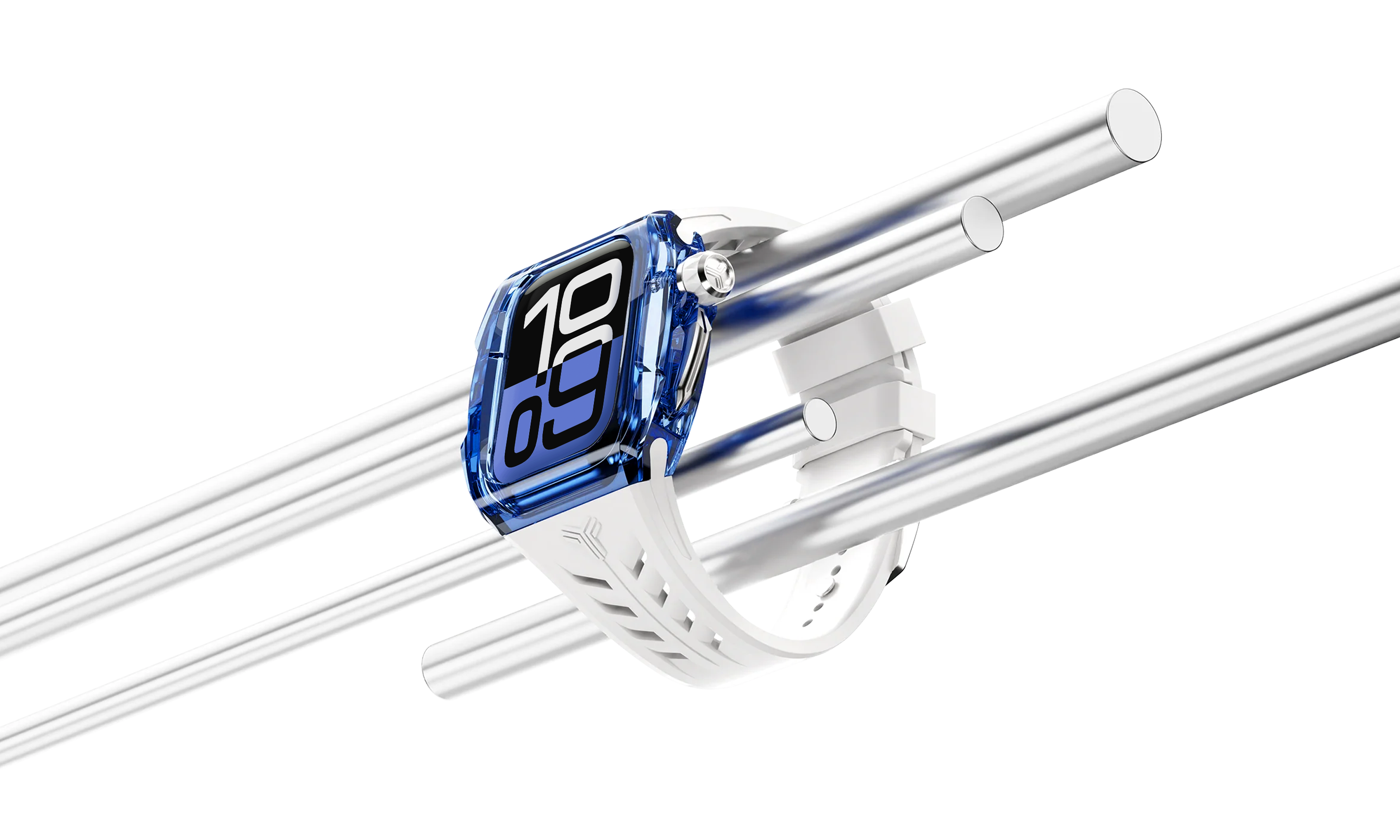 Elevate your Apple Watch Series 10 with the Bondi Nylon Edition. Featuring a crisp white strap and a blue transparent case with silver accents, it’s a perfect balance of style and protection. With a seamless two-click installation, no screws are needed—just snap it on and go.