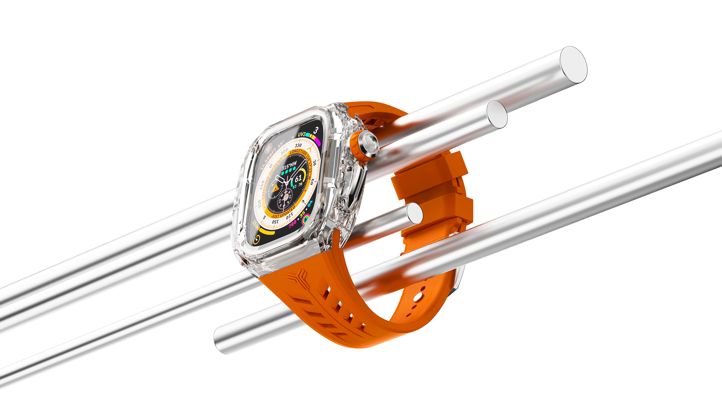 Elevate your Apple Watch Ultra with the Sentosa Edition. Designed for the adventurous, it features a rugged orange strap and a transparent case with silver accents, merging durability with style. The no-screw installation makes it easy to transform your watch for any extreme condition, ensuring both protection and a bold new look.