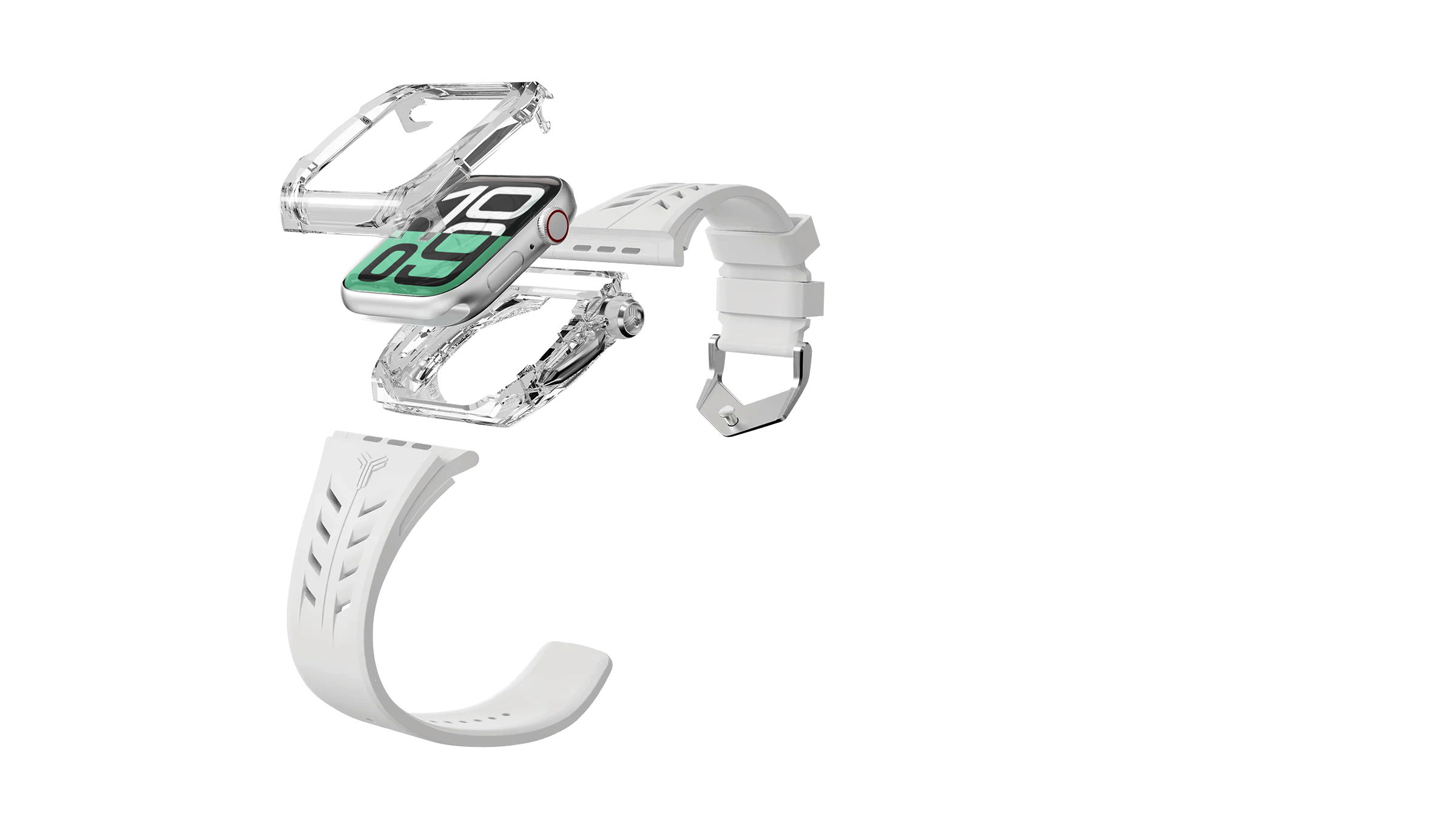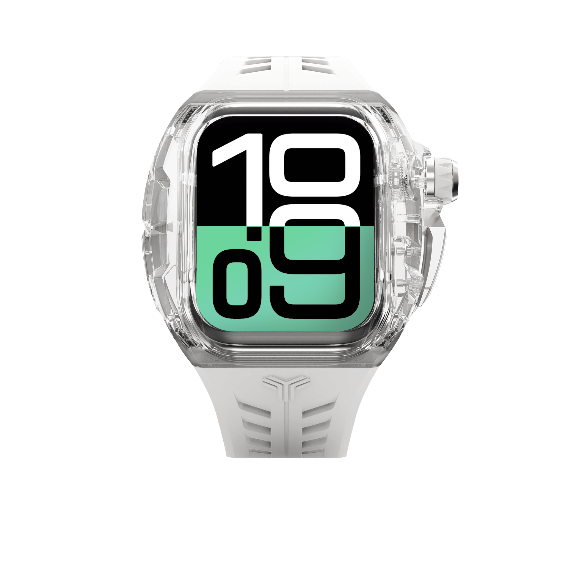 Transform your 46mm Apple Watch with the Silverlake case, where sophistication meets design. Featuring a soft white strap and a transparent nylon bezel, this case creates a striking contrast for a refined aesthetic. The transparent design offers a glimpse of the Apple Watch and the stainless steel case mechanisms, adding a layer of elegance and precision.