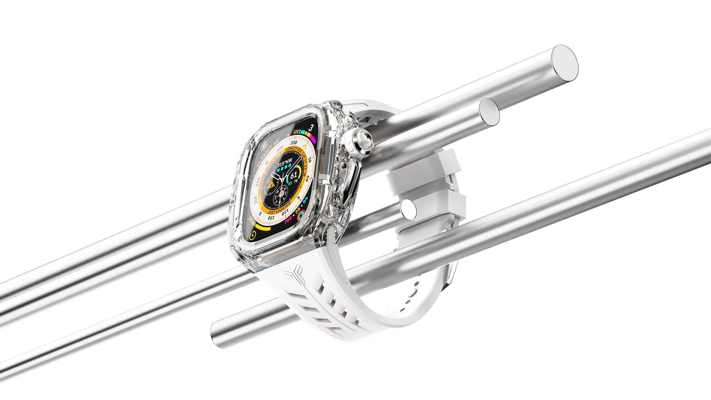 Upgrade your Apple Watch 49mm to the epitome of sophistication with the Silverlake. This exceptional case features a soft white strap and transparent nylon bezel for a sophisticated contrast and a refined look. See the Apple Watch and the case mechanisms in stainless steel on display through the transparent case for an added touch of refinement.