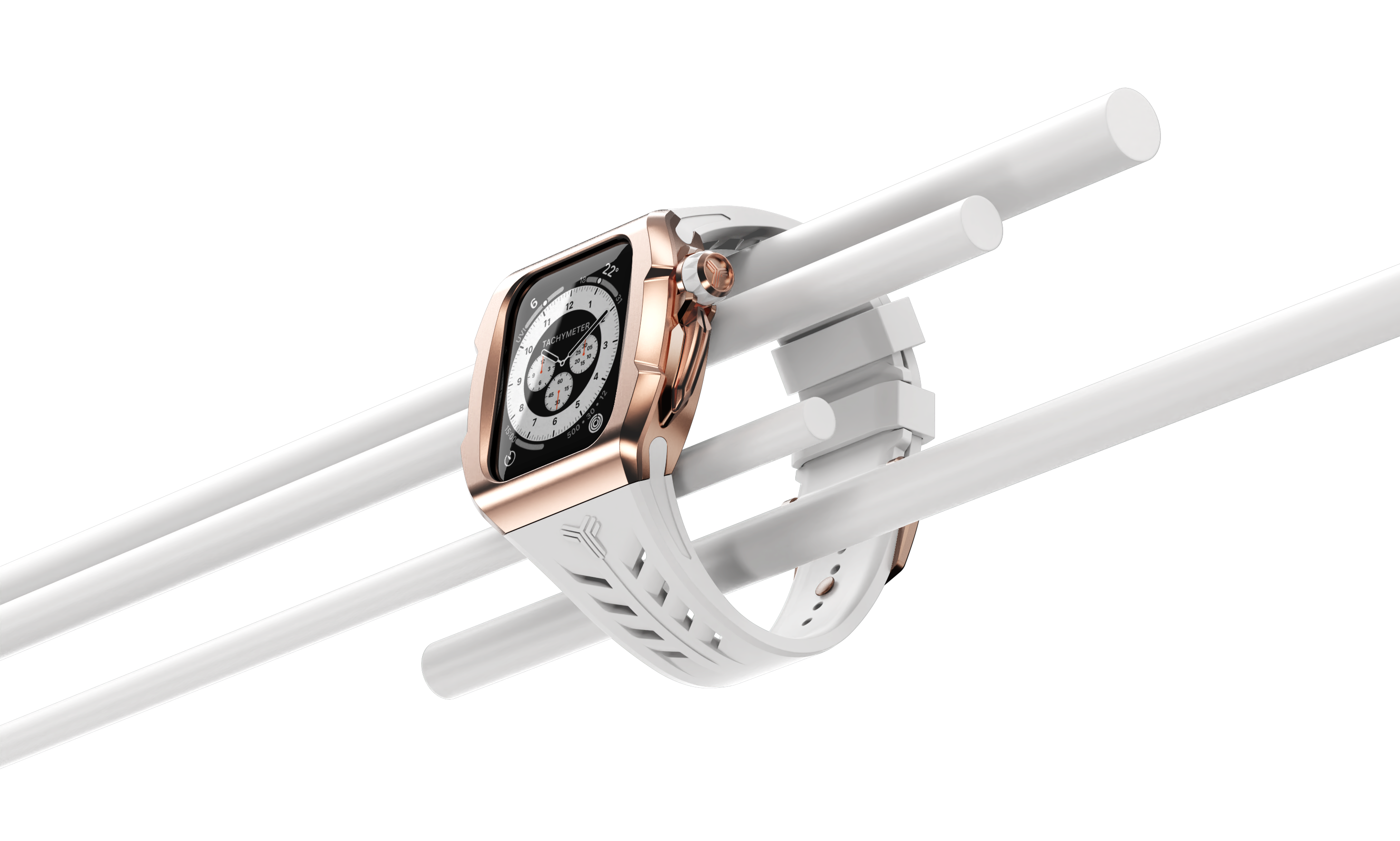 Elevate your Apple Watch 45mm to new heights with SOHO edition. Let the mesmerizing Rose Gold coupled with the vibrant white strap, redefine your style while providing reliable protection for your cherished device.