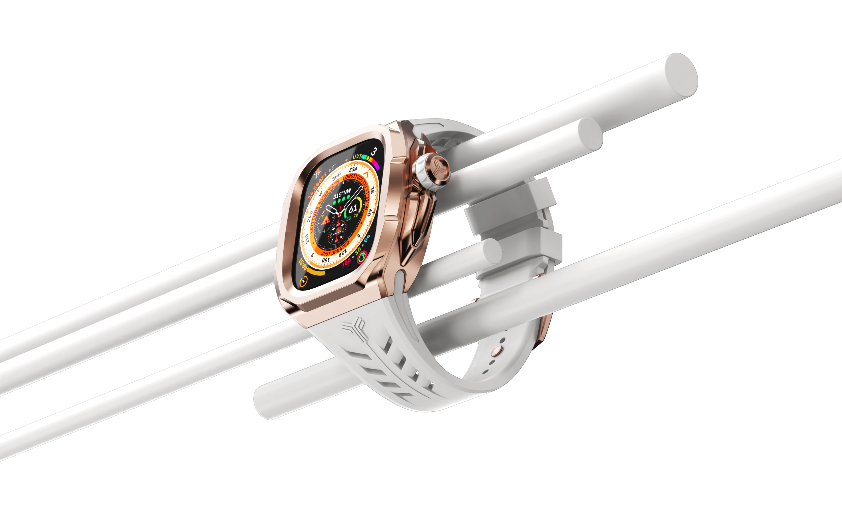 Upgrade your Apple Watch Ultra with the new SOHO edition crafted with precision from 316L stainless steel. The white strap and rose gold accents create a visually striking aesthetic that is both timeless and fashionable.